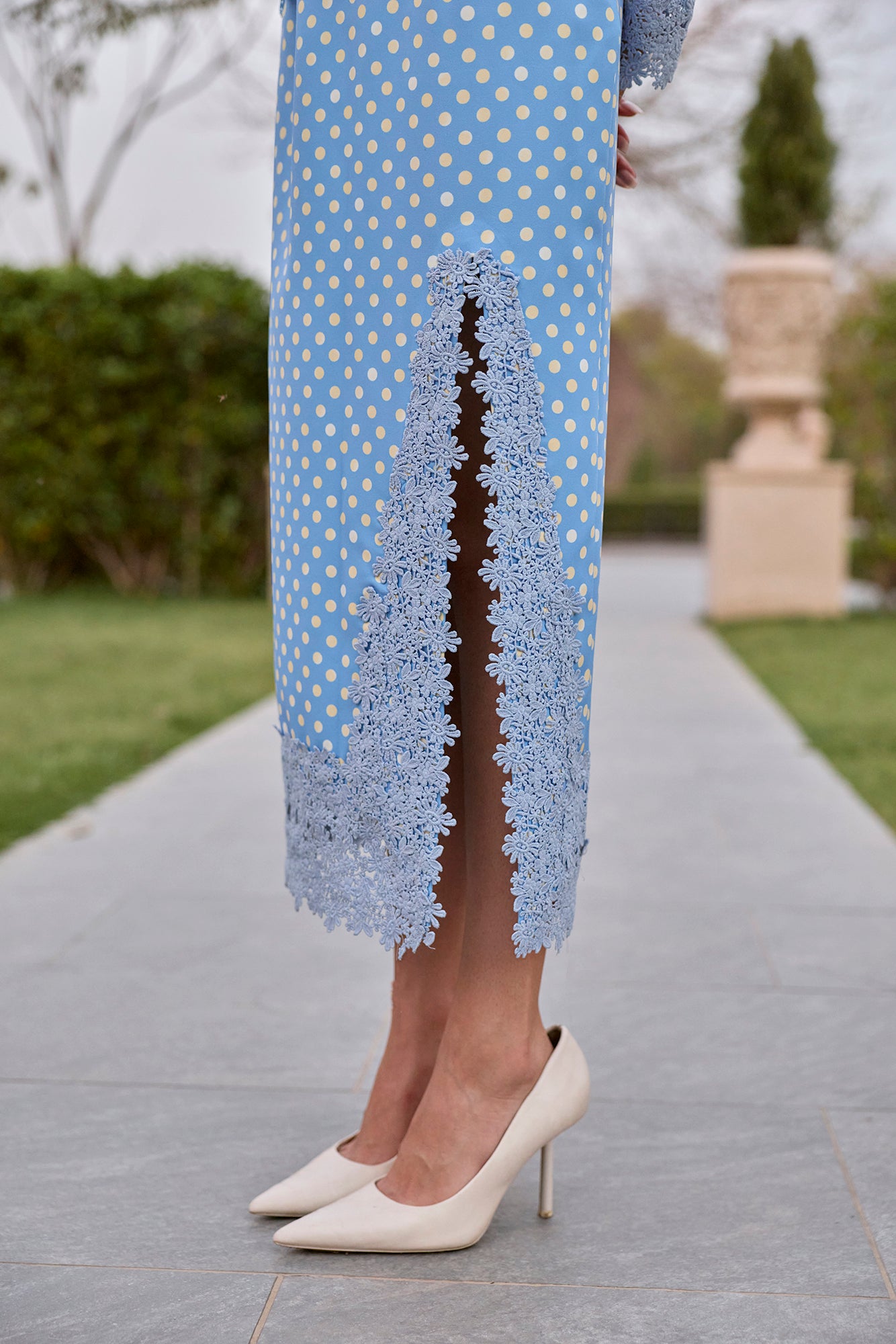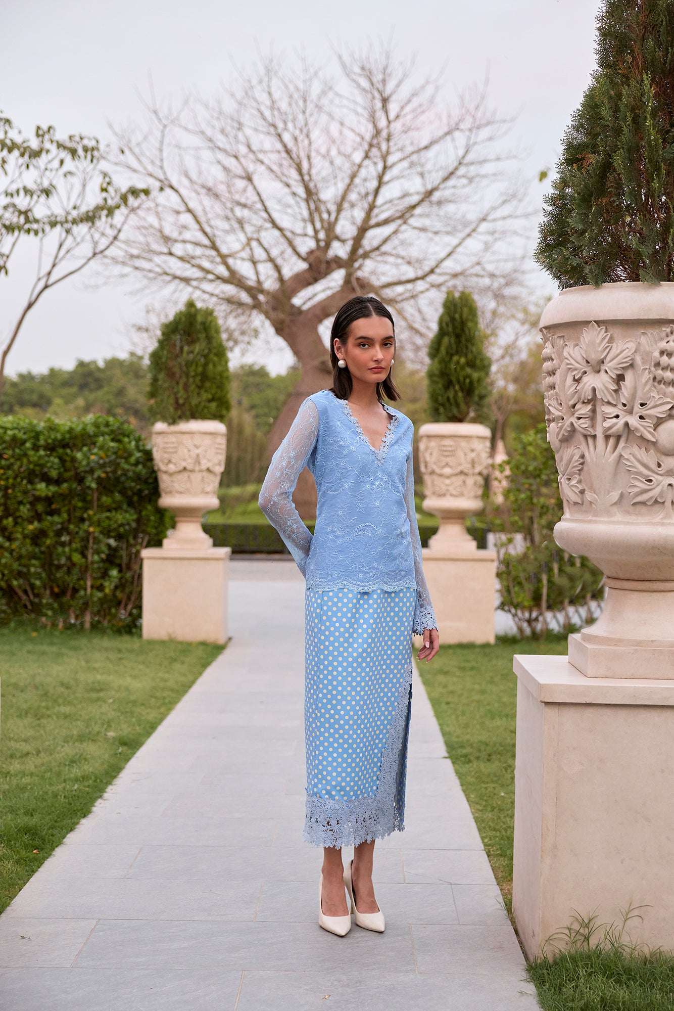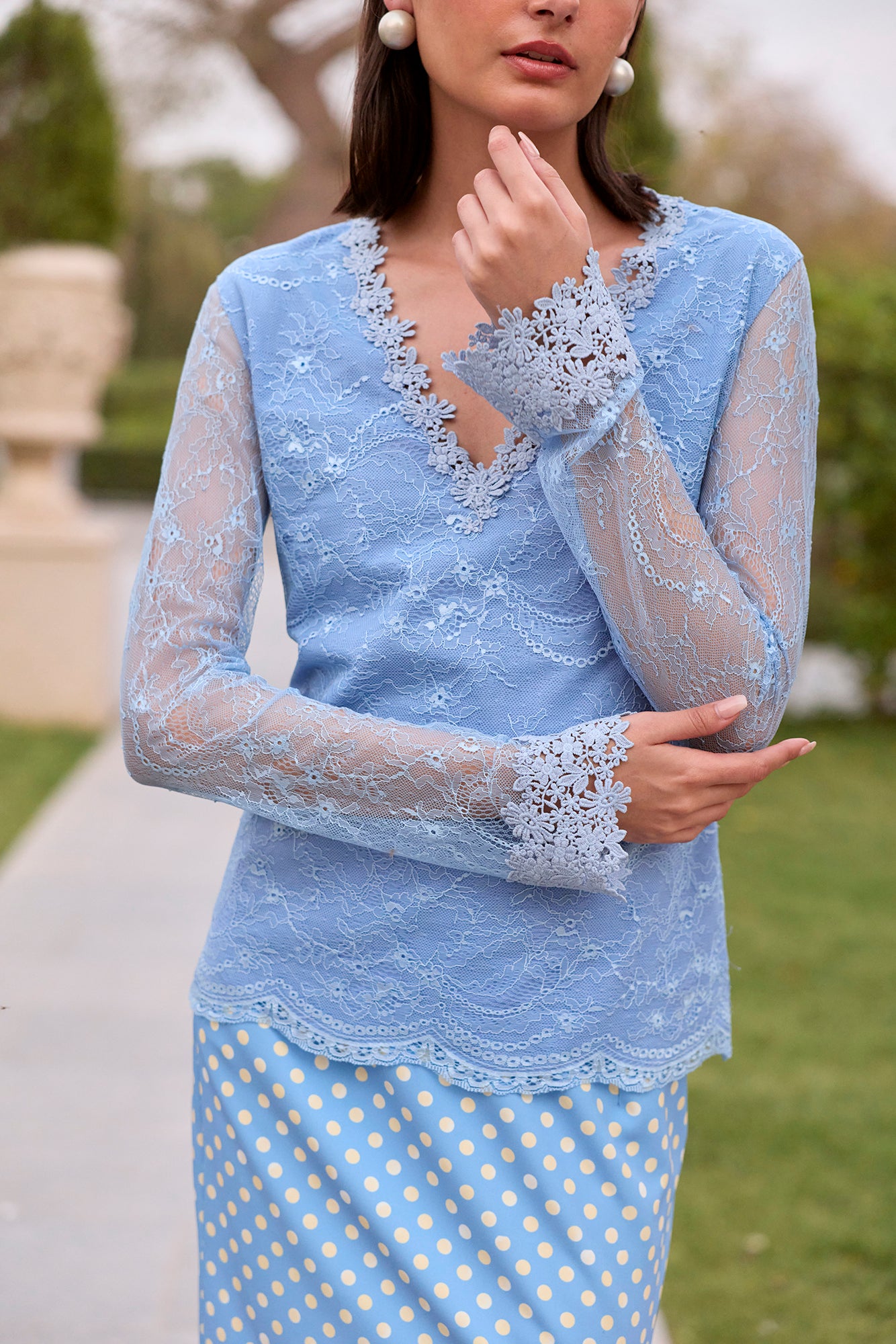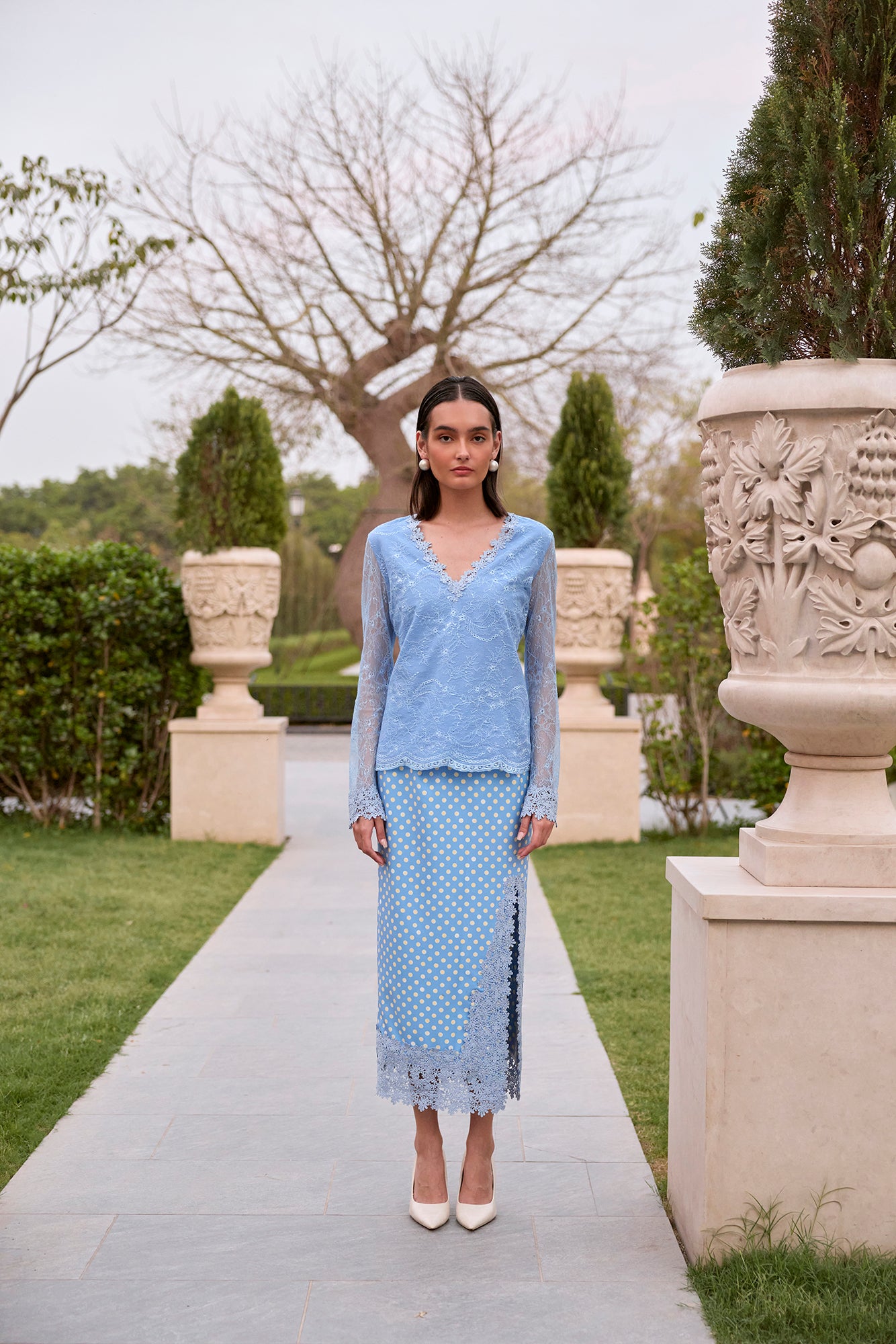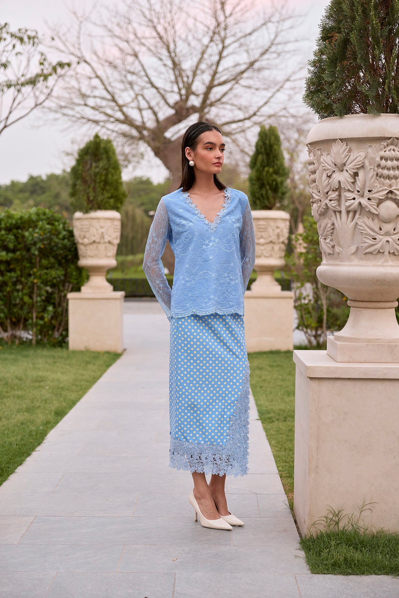 lace top and printed skirt with lace detailing