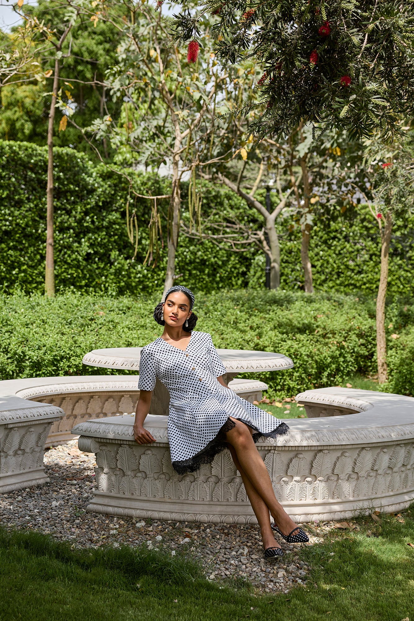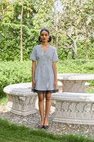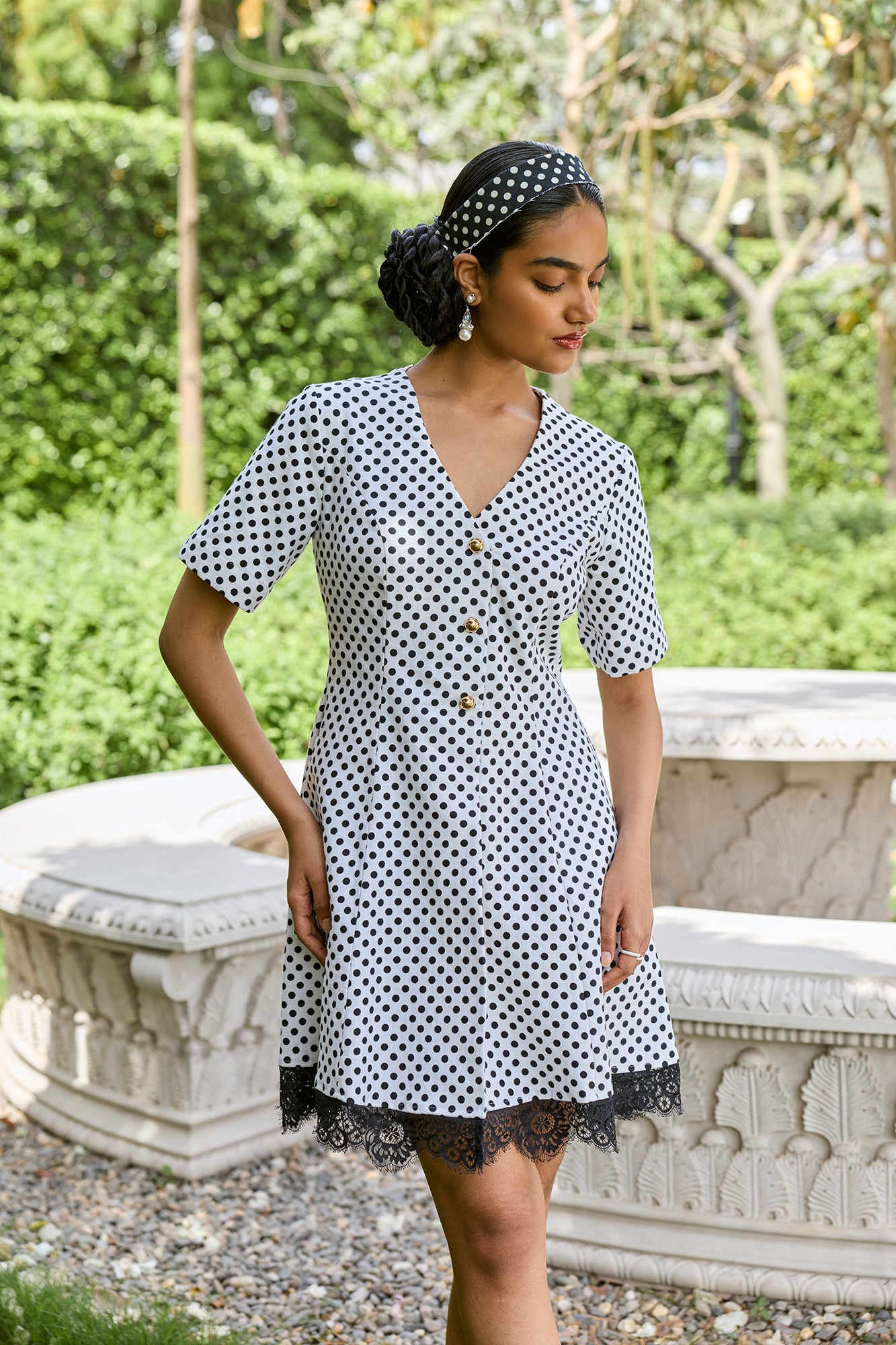 denim polka dress with lace detailing